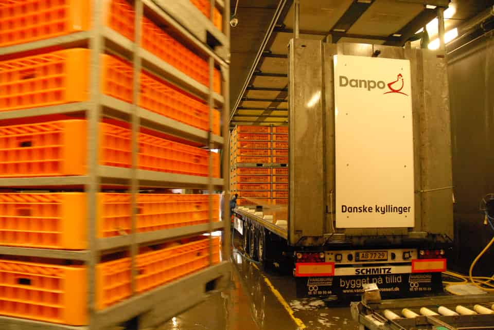 23 trucks from all over the country transport approximately 200,000 chickens for slaughter at Danpos plant in North Jutland per day. Danpo A/S is a division in the Scandi Standard group of poultry companies.